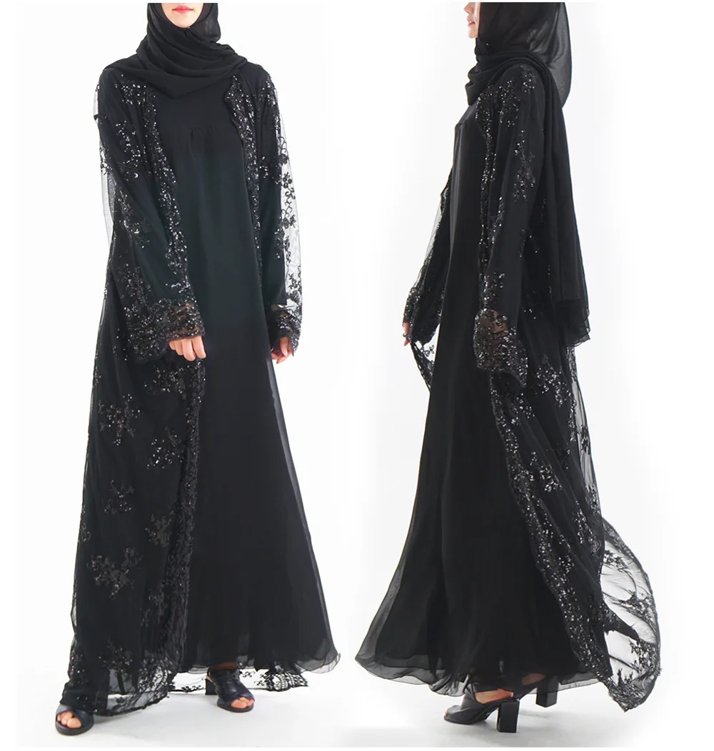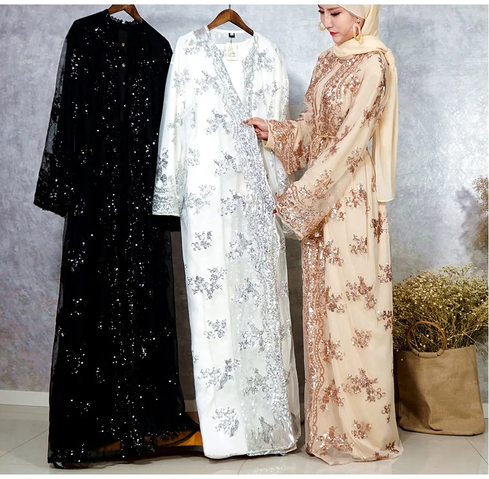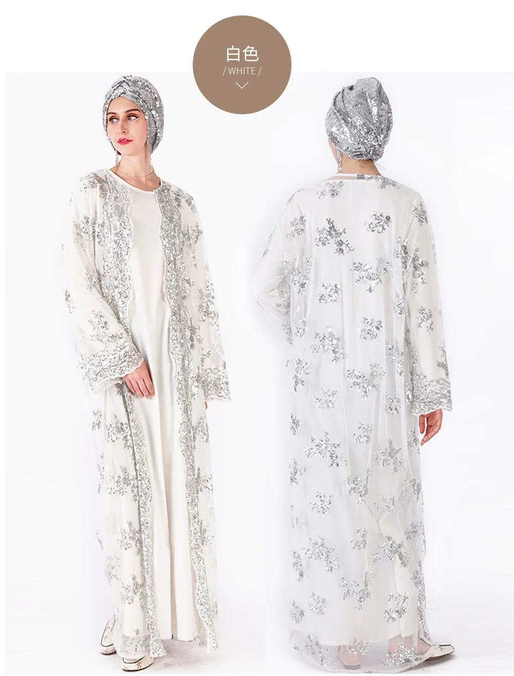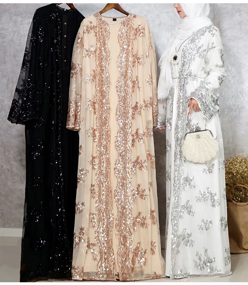 2025 New Black White Sequin Kimono Cardigan Abaya Dubai Luxury Muslim Kaftan Abayas For Women Turkish Islamic Clothing Outfit