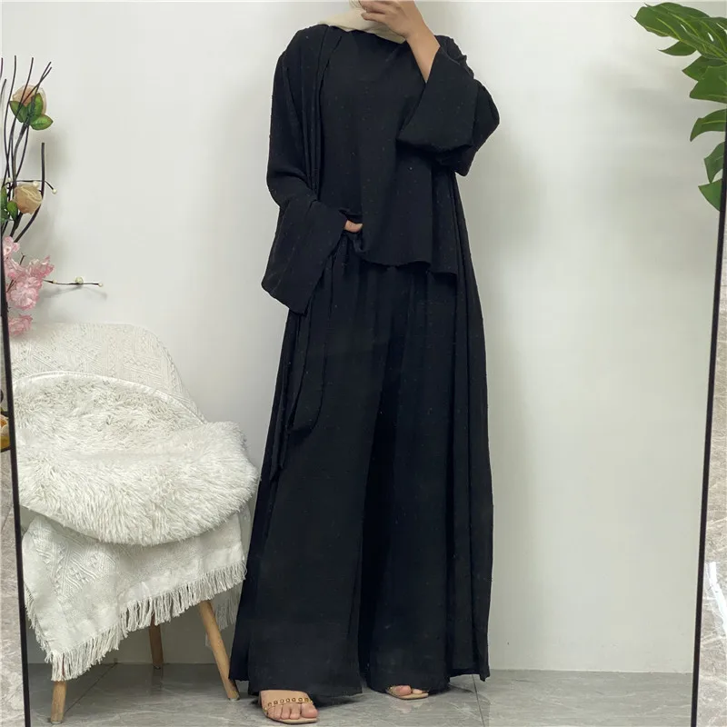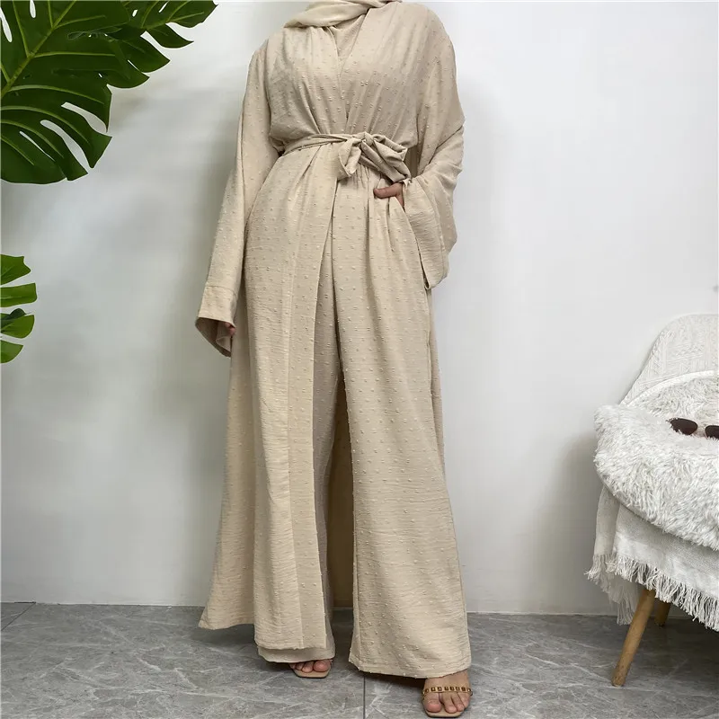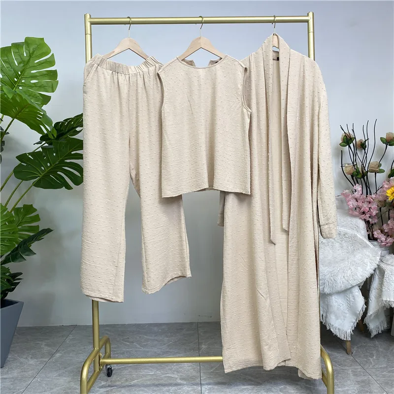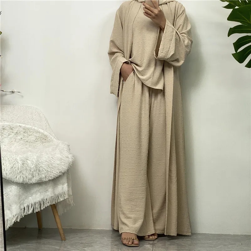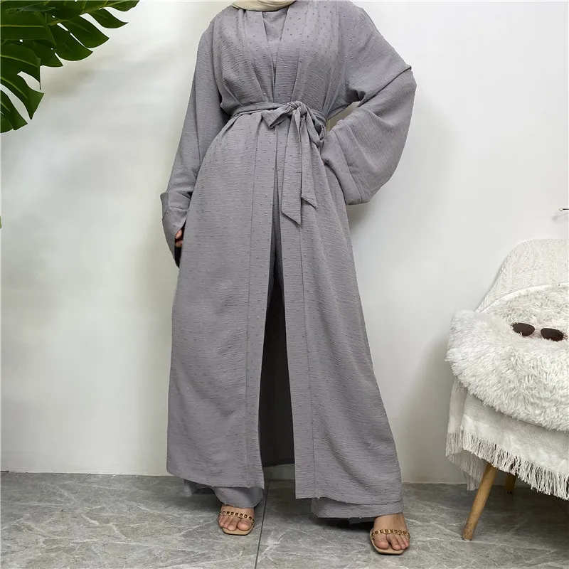 3 Piece Set Eid Muslim Dress Women Open Abaya Kaftan Dubai Kaftan Tops Pants Turkey Islam Kimono Robe Femme Musulmane Ensembles