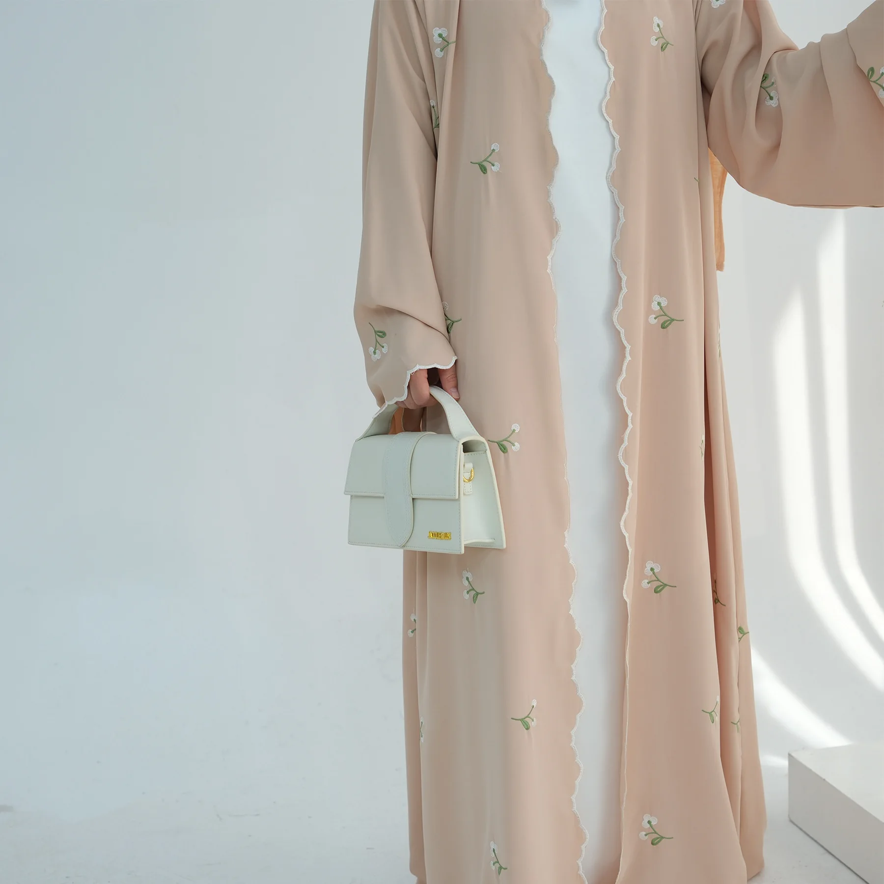 New Fashion Nida Dubai Abaya Ladies Floral Embroidered Kimono Style Muslim Dress Breathable Cotton Autumn Clothing